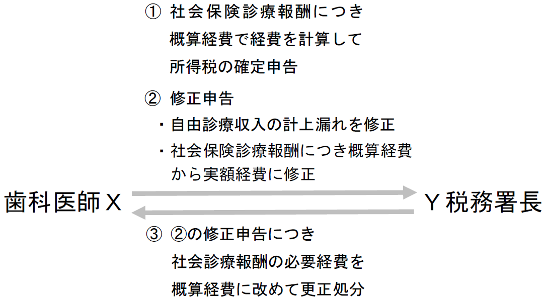 その後、Xは、自由診療収入の計上漏れと、上記計算誤りに気付き、自由診療収入を修正し、また、社会保険診療報酬については概算経費ではなく実額経費で経費を計上して修正申告をした。これに対し、Y税務署長は、社会診療報酬の必要経費を概算経費に改めて更正処分をした。そこで、Xは、更正処分の取消しを求めて提訴した。