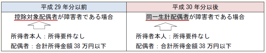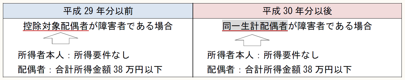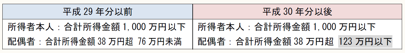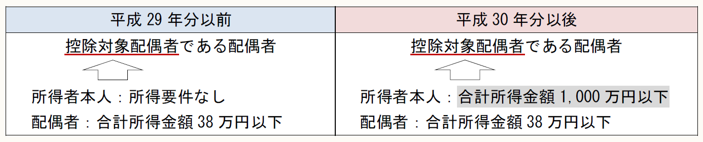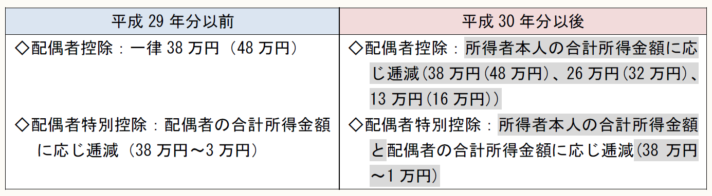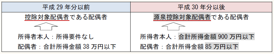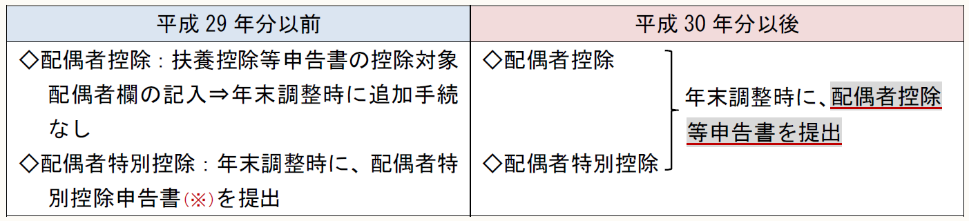 平成29年度税制改正において配偶者控除及び配偶者特別控除に見直しが行われ、平成30年分の所得税から適用されている。この見直しにより、平成29年分以前と平成30年分以後では、源泉徴収事務及び年末調整事務のうち、以下の点が変更されている(所法83、83の2、79②)。