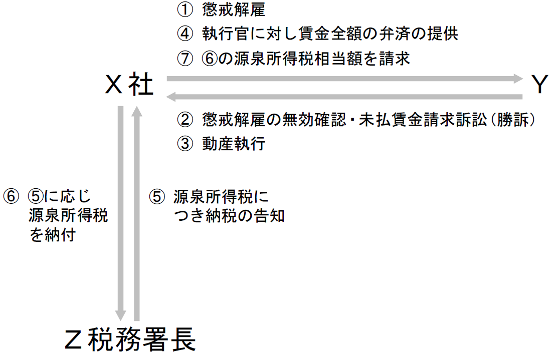 その後、Z税務署長は、これに関し、X社に対して源泉所得税についての納税の告知をした。X社はこれに応じて源泉所得税を納付した上、Yに対し、源泉所得税相当額を返還するよう求めたのが本件である。