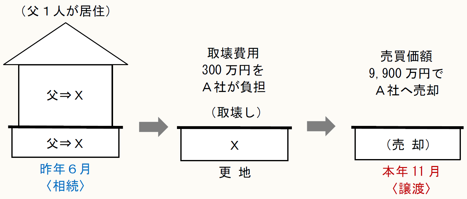 Xは、昨年6月に死亡した父親の家屋(昭和56年5月31日以前に建築)とその敷地を相続により取得した後に、その家屋を取り壊して更地にし、本年11月にA社に対し9,900万円で売却しました。