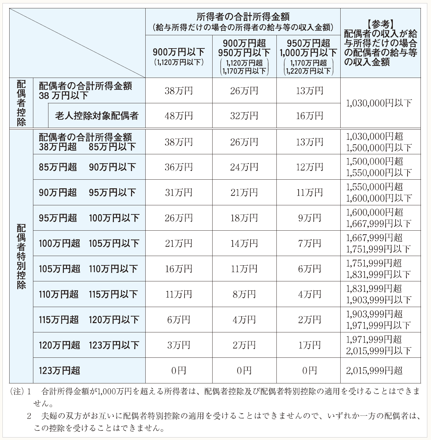 平成30年分以後の配偶者控除額及び配偶者特別控除額を、納税者本人及び配偶者の合計所得金額に応じて整理すると次のとおりである(所法83①、83の2①)。