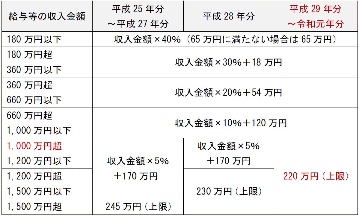 平成29年分から令和元年分の所得税における給与所得控除額の上限は、給与等の収入金額1,000万円超に適用される220万円(※)となる(所法28②③)。