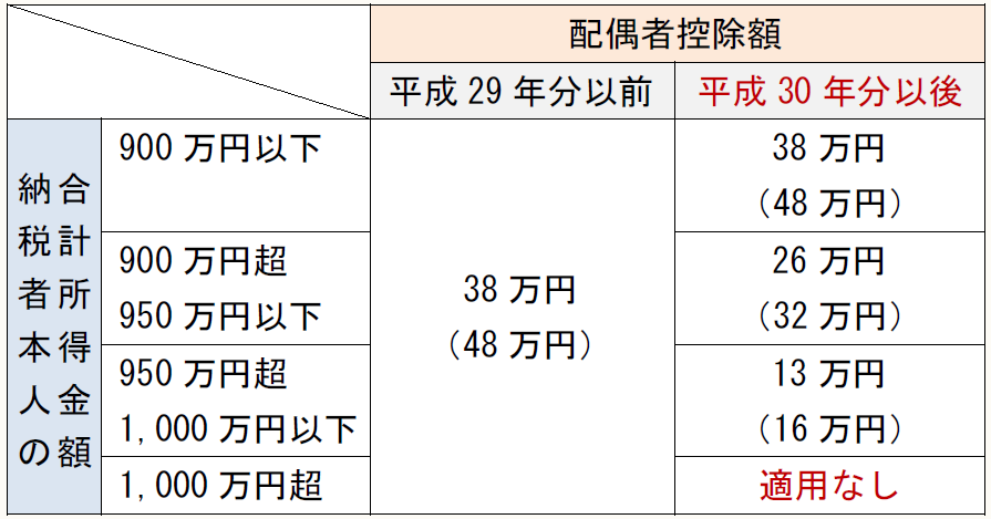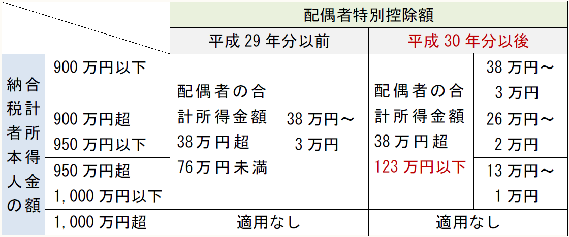平成29年度税制改正において配偶者控除及び配偶者特別控除の見直しが行われ、平成30年分の所得税から適用されている(所法83①、83の2①)。