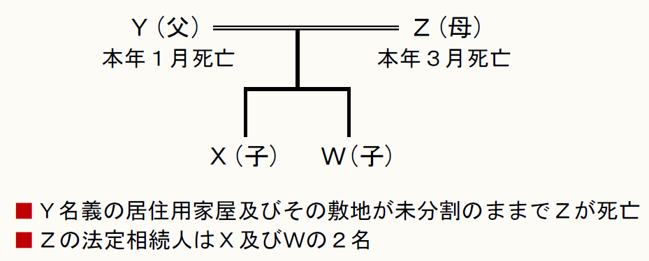 本年1月にY(父)が死亡し、その際の相続人は、Z(母)、X(子)及びW(子)の計3名でしたが、Yに遺言はなく、遺産分割協議を行う前、同年3月にZが続いて死亡しました。