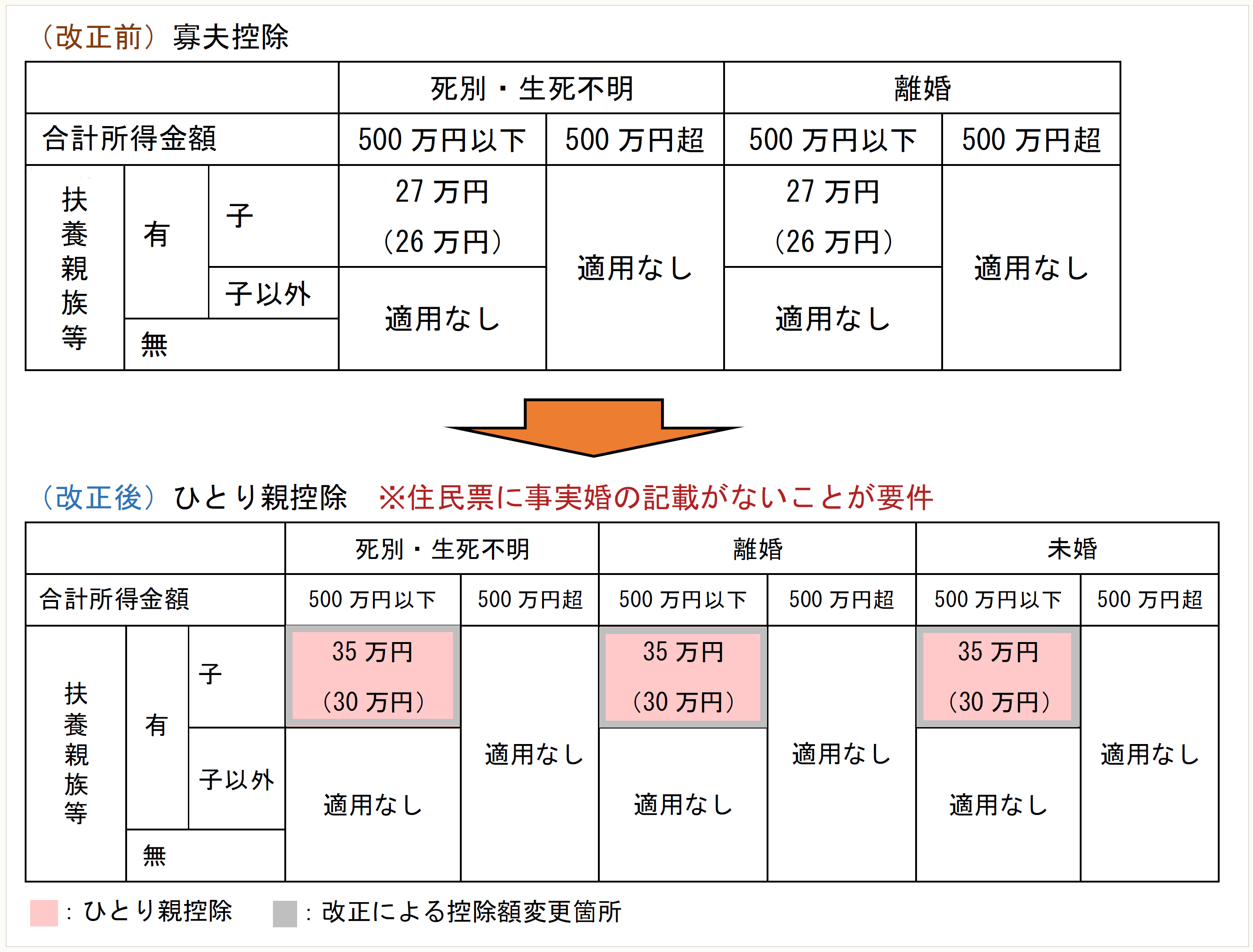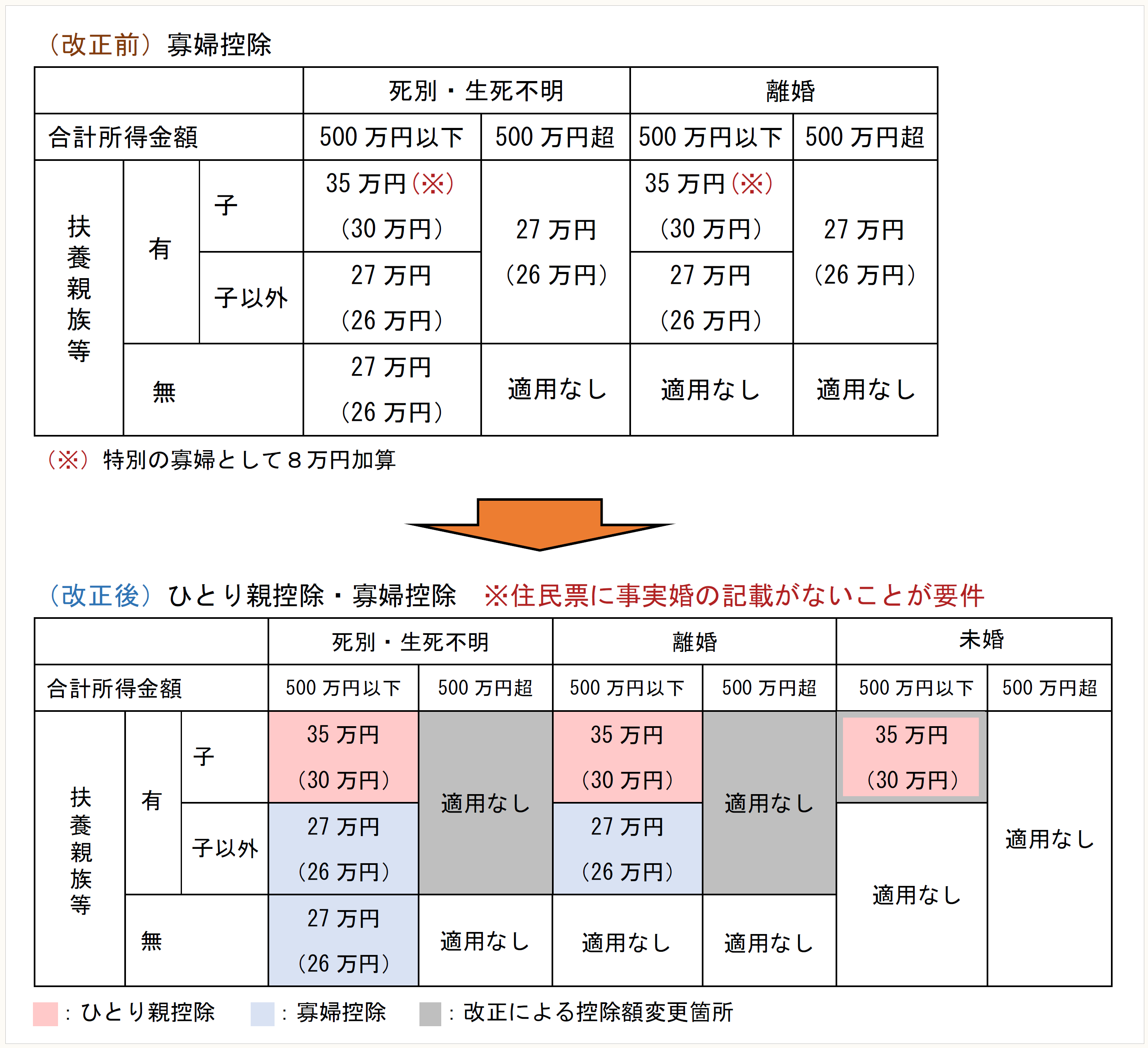 ひとり親控除の創設により、生計を一にする子を有する寡婦に対する寡婦控除と寡夫控除はひとり親控除に統合され、特別の寡婦に対する加算は廃止された。また、ひとり親控除は、婚姻を前提とした制度ではないため、未婚のひとり親にも適用される。