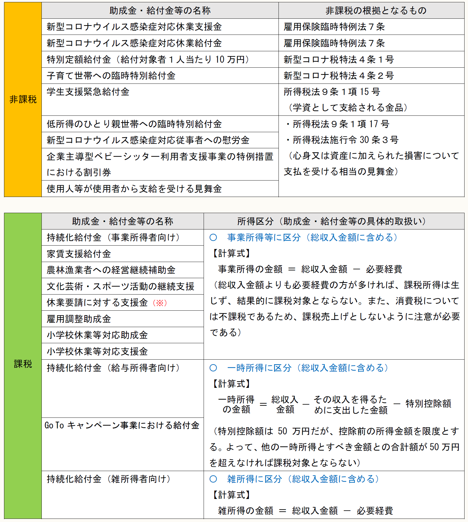 助成金・給付金等には課税されないもの(非課税)と課税されるものがある。非課税となるためにはその支給の根拠となる法令や所得税法の規定が必要である。主な助成金・給付金等について非課税の根拠となるものは下表のとおりである。それ以外の助成金・給付金等は、課税の対象となる(所得税法施行令94条1項2号)。