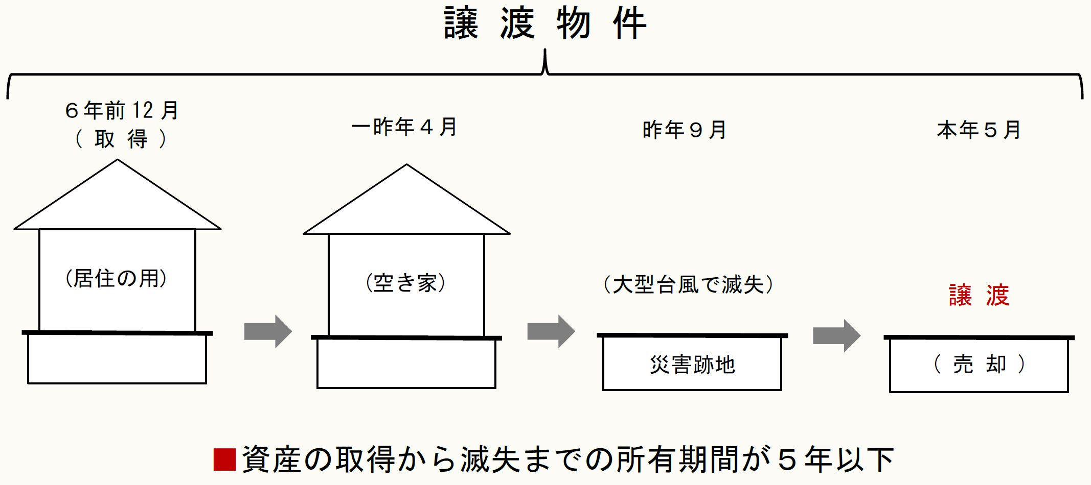 Xは、6年前の12月に居住用家屋とその敷地を東京に取得しました。一昨年の4月に大阪へ転勤となり、その家屋は空き家となっていましたが、昨年の9月の大型台風でその家屋は滅失してしまいました。本年の5月にその敷地を売却しましたが、多額の譲渡損失が発生しました。なお、災害で滅失したその家屋の取得から滅失までの所有期間は、5年超の要件を満たしていません。