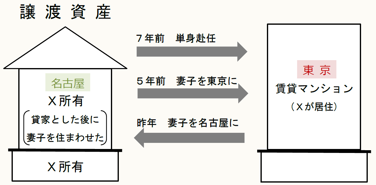 転勤から2年後、Xは妻子を東京へ呼び寄せて同居し、名古屋の自宅を他人に貸し付けていました。しかし、昨年になって、約3年間住んだ借家人が立ち退いたことから、再び妻子を住まわせました。