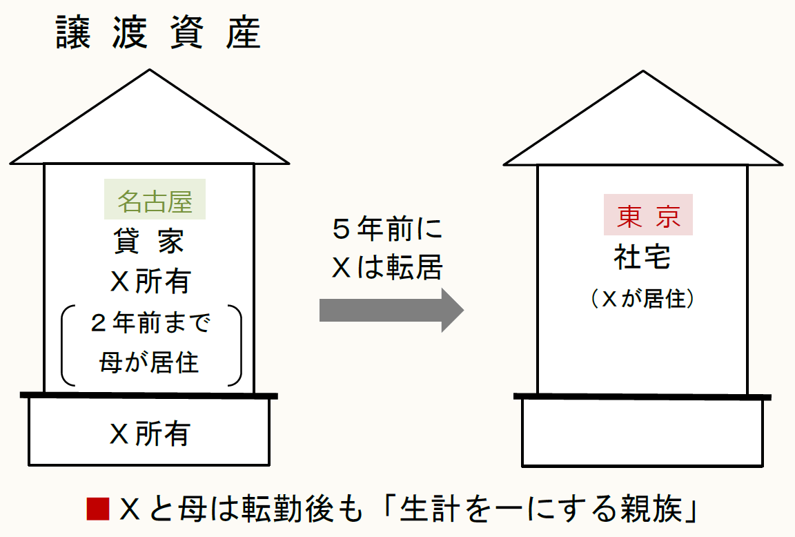Xは、名古屋にあるX所有の家屋にXの両親と一緒に居住していました。5年前、東京本社へ転勤となったため東京の社宅に転居し、名古屋にある家屋には両親だけが居住していました。転勤後、両親の生活を支えるため毎月送金を続けていましたが、2年前に父が死亡したことから、母を東京の社宅に引き取って、名古屋の家屋は他人に賃貸していました。