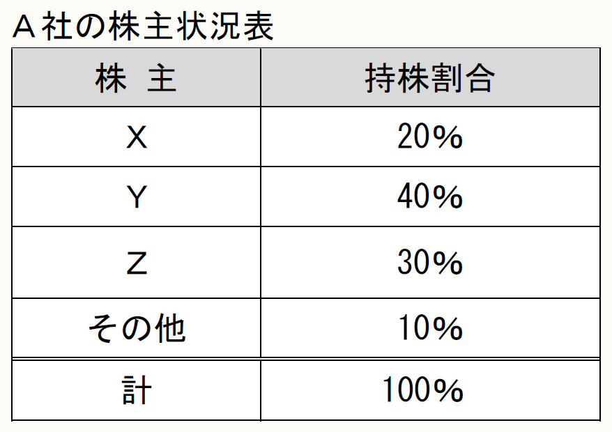 A社の株主は、次の表のとおりであり、A社は法人税法第2条(定義)第10号に規定する同族会社に該当します。