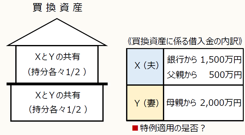 買換資産に係る借入金の内訳は、Xが銀行からの1,500万円及び父親からの500万円の計2,000万円、Yは母親からの2,000万円となっています。