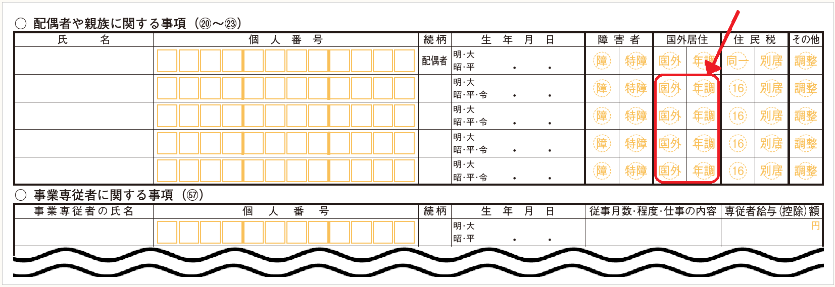 なお、扶養親族が国外居住親族に該当し、年末調整において扶養控除又は障害者控除の適用を受けている場合には、「年調」に〇をつける。