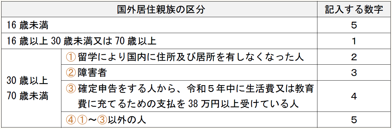 扶養親族が国外居住親族である場合には、確定申告書第二表「配偶者や親族に関する事項」の「国外居住」欄の「   」に、国外居住親族の区分に応じて該当する数字(下記《表1》参照)を記入する。