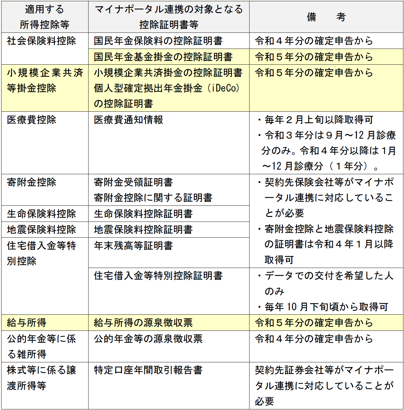 令和5年分の確定申告において、マイナポータル連携の対象となる控除証明書等をまとめると次のとおりとなる。