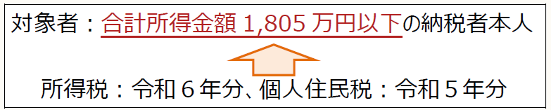定額減税の適用には所得制限があり、対象となるのは、所得税は令和6年分、個人住民税は令和5年分の合計所得金額が1,805万円以下(給与所得のみの場合、給与収入2,000万円以下)の納税者本人に限られる(措法41の3の3①、地税附則5の8①)。