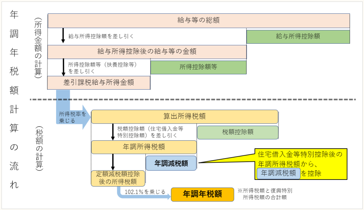 年調減税額控除後の所得税額に102.1%を乗じ、年調年税額(所得税額+復興特別所得税額)を算出、年調年税額と1年間の源泉徴収税額とを比較し、過不足額を精算