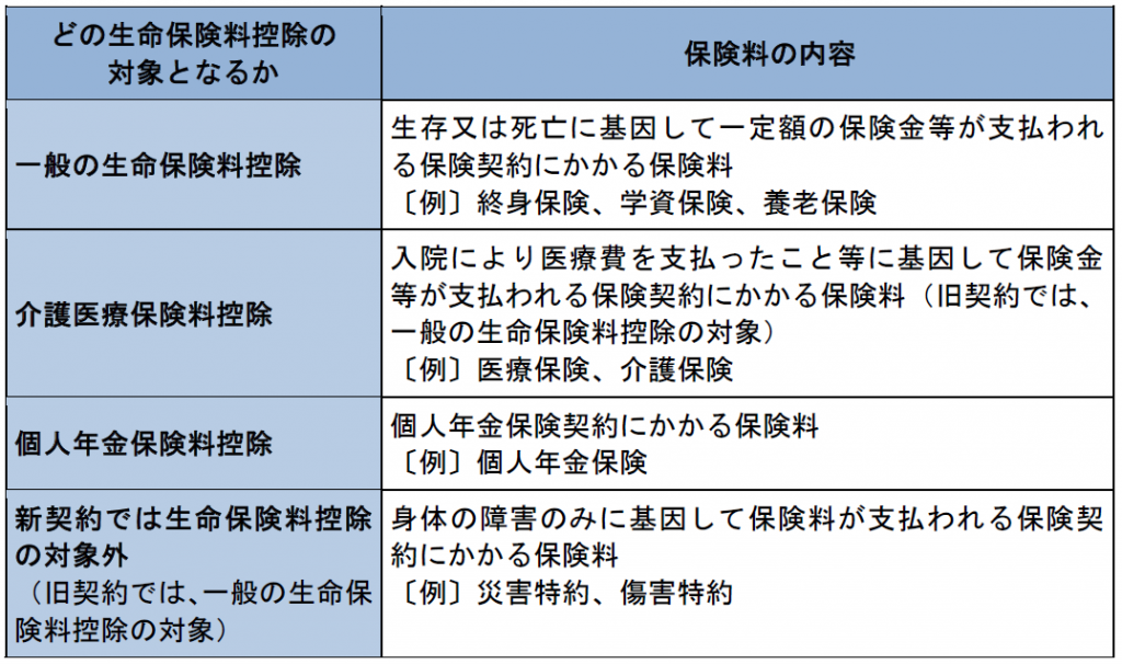 新契約にかかる保険料は、契約の保障内容に応じ、次のように区分される(支払った保険料が具体的にどの控除の対象となるかは、保険会社から発行される控除証明書に記載される)。