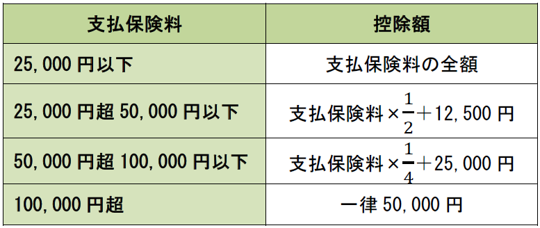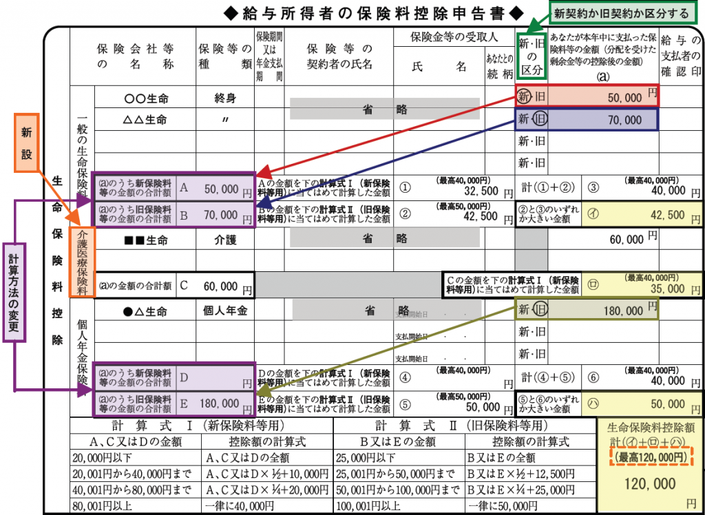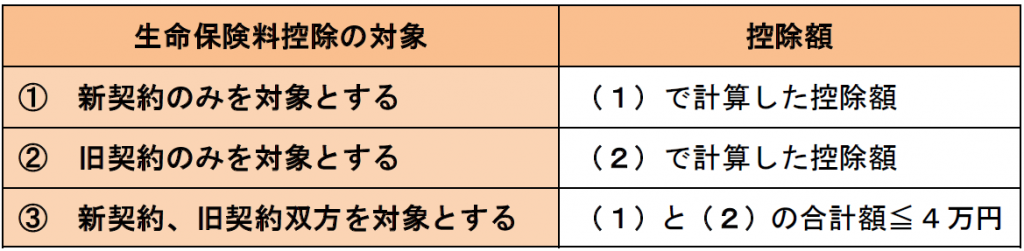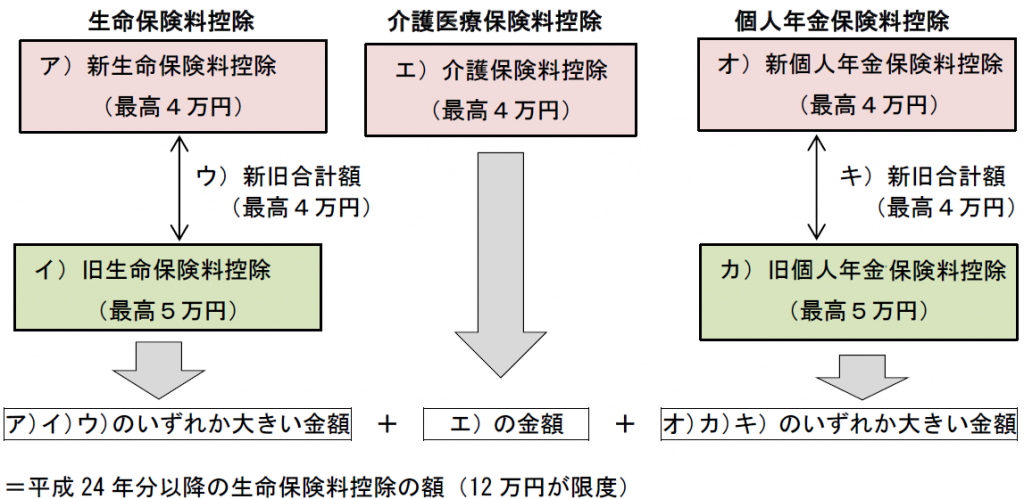 これら3つの控除額は、保険契約の締結時期が平成24年1月1日以降(新契約)か平成23年12月31日以前(旧契約)かによって、下記の【2】(1)(3)の計算式を適用し、別々に計算する。ただし、適用限度額は3つの合計で12万円である。