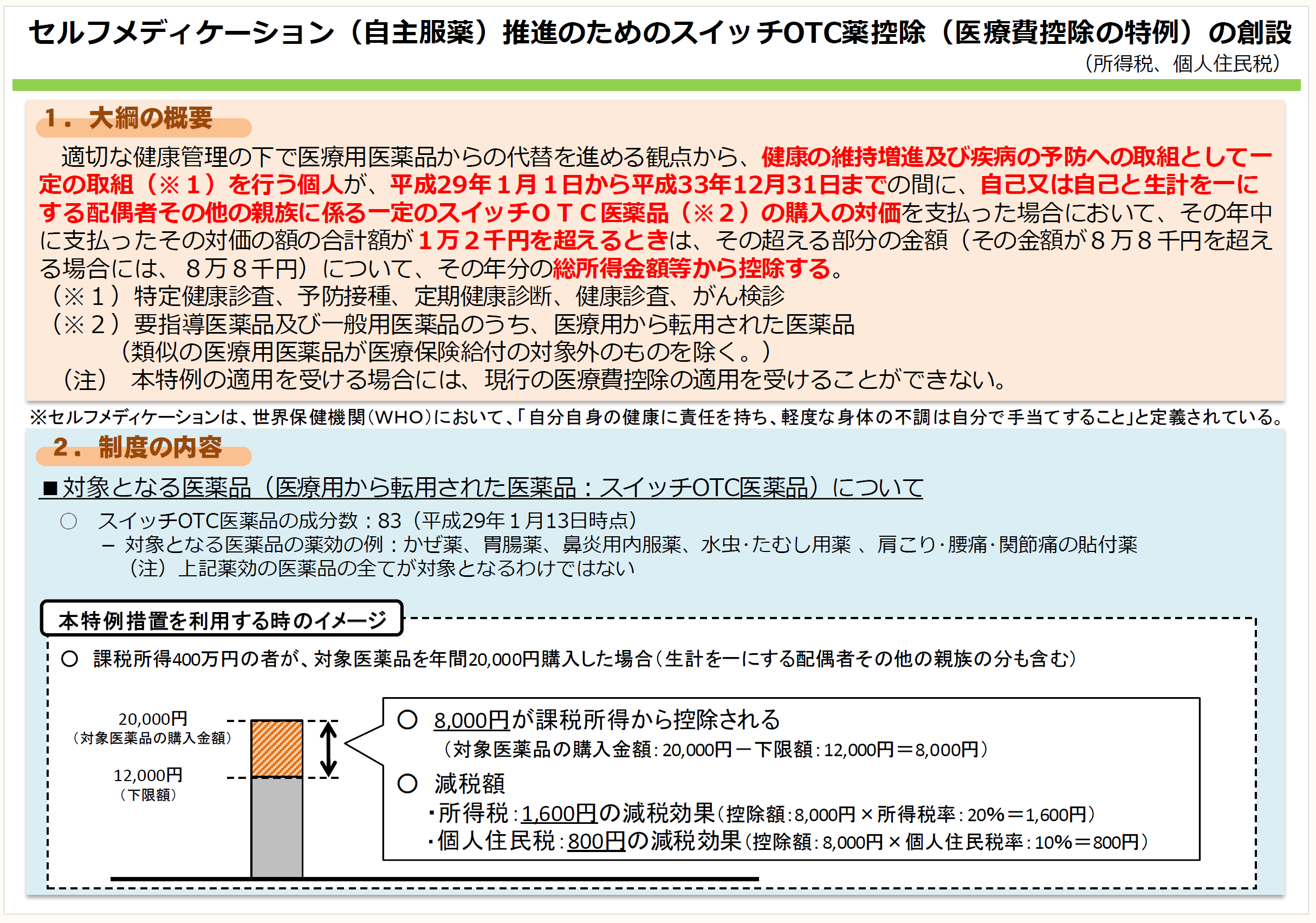 セルフメディケーション税制は平成29年1月1日から平成33年12月31日までの間に購入した「スイッチOTC医薬品」を対象として、その年中に支払った対価の額が1万2,000円を超えた部分(8万8,000円を上限)について、その年分の総所得金額から控除するという医療費控除の特例制度だ。