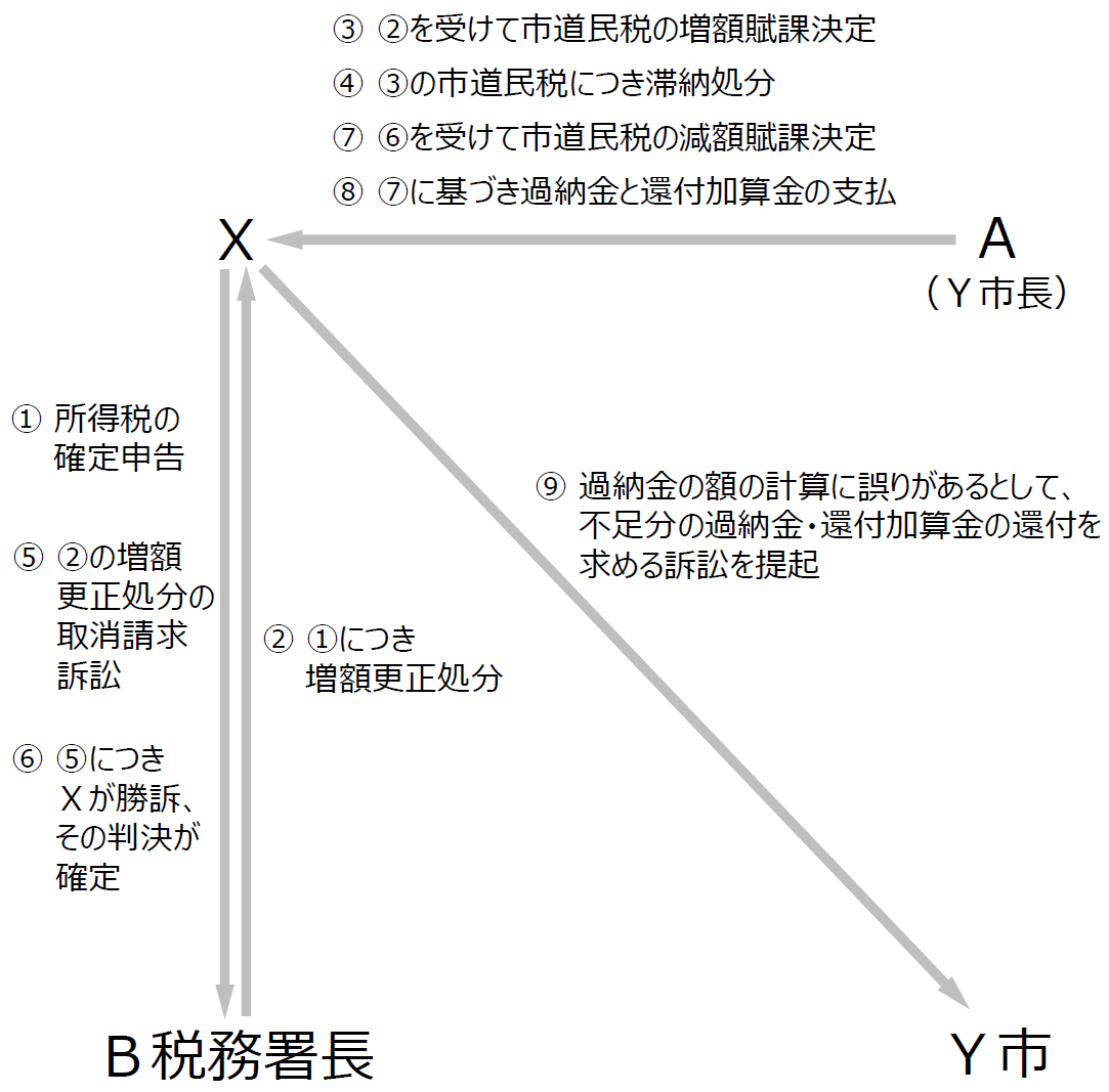 Xが複数の年分の所得税の確定申告をしたところ、B税務署長は、Xに対し、各年分の所得税について増額更正処分をした。A(Y市長)は、これを受けて、Xに対し、各年度分の市道民税の増額賦課決定をし、当該市道民税につき、滞納処分(預金債権の差押え等)をした(本件滞納処分)。徴収された金銭は、当該市道民税に順次配当された。