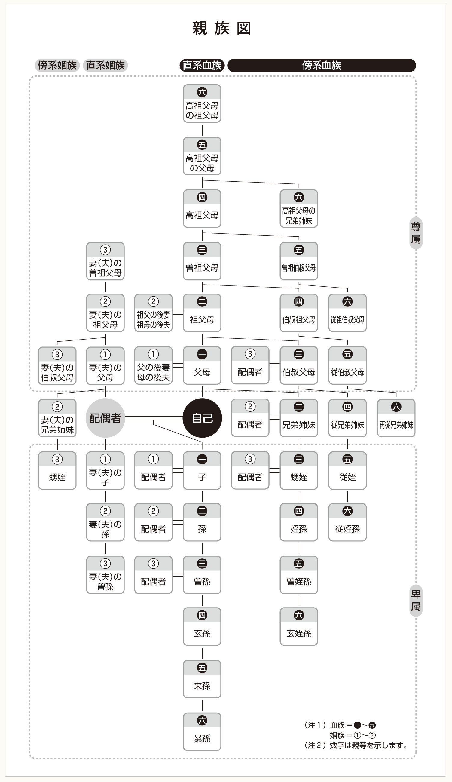 3親等内の親族とは、次の親族図のうち「①から③」及び「一から三」の範囲の者をいう。