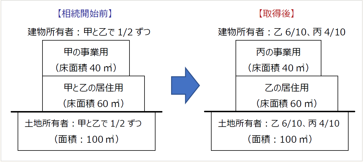 被相続人である甲は、100%所有していた土地(100㎡)及び家屋(40㎡は甲の事業用、60㎡は甲と配偶者乙の居住用)について、生前に土地の持分2分の1、家屋の持分2分の1を配偶者乙に贈与を行い、乙は贈与税の配偶者控除を適用して申告を行っています。贈与税の配偶者控除の適用については、相続税法基本通達21の6-3のただし書きの適用を受け、優先的に受贈配偶者の居住用部分として、土地家屋の2分の1相当は居住用不動産の贈与を受けたものとして贈与税の申告を行っています。甲の相続により、甲の土地家屋の持分2分の1について、乙が10分の2、長男である丙が10分の8の割合で相続することになり、最終的な土地家屋の持分は、乙が10分の6、丙が10分の4となりました。