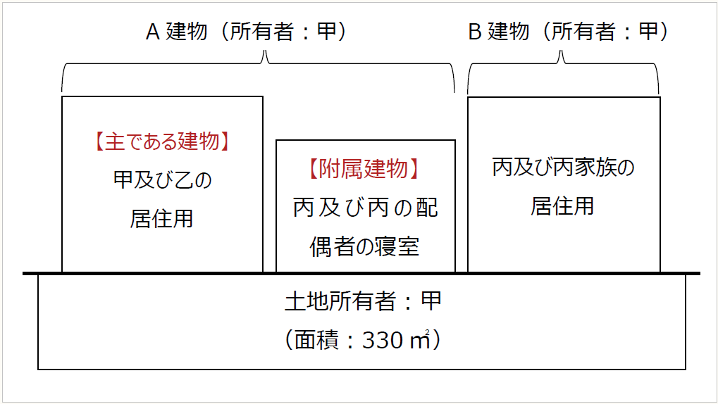 被相続人である甲(相続開始は令和4年2月1日)は、下記の宅地(330㎡)の上にA建物及びB建物を所有していました。A建物は主である建物120㎡、附属建物50㎡となっており、被相続人及びその配偶者乙が主である建物に居住し、附属建物は、離れ家のトイレと部屋のみであり、長男丙及び丙の配偶者の寝室として利用していました。B建物は丙と丙の配偶者及び子が居住の用に供していました。甲の推定相続人は、乙及び丙の2人であり、乙がA建物及び上記土地の2分の1を取得し、丙がB建物及び上記土地の2分の1を取得しています。丙は被相続人と生計を別にしている親族に該当します。