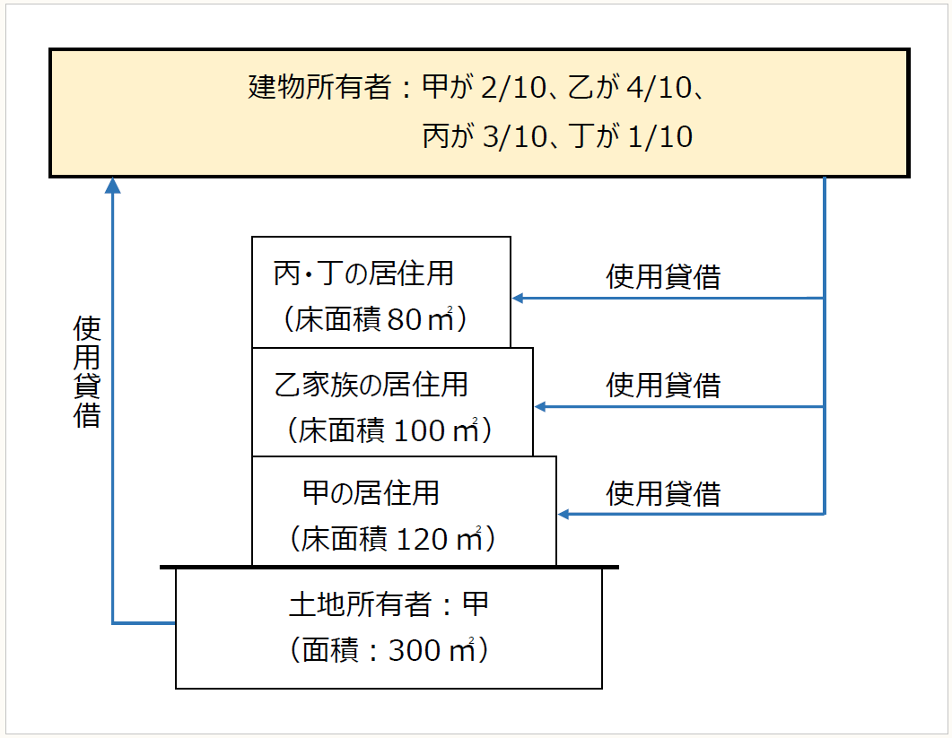 被相続人である甲(相続開始日:令和4年2月1日)は、下記の土地及び家屋を所有していました。土地建物の生前の利用状況は、下記の通り、1階部分は甲が居住の用に供し、2階部分は生計を別にする長男乙家族が居住の用に供し、3階部分は生計を別にする被相続人の兄である丙とその内縁の妻である丁が居住の用に供しています。土地は被相続人が100%所有していますが、建物は、甲が2/10、乙が4/10、丙が3/10、丁が1/10所有しています。建物の各階ごとに玄関があり構造上区分された建物ですが、区分登記はしていません。甲は建物所有者から地代を収受しておらず、建物所有者も建物利用者から賃料は収受していません。