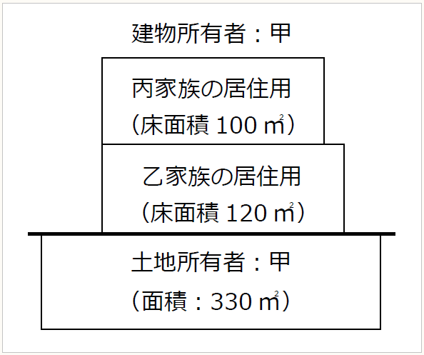 被相続人である甲(相続開始日:令和4年3月20日)は、下記の土地及び家屋を所有していました。土地建物の生前の利用状況は、下記の通り、1階部分は長男である乙が居住の用に供し、2階部分は長女である丙及び丙家族が居住の用に供しています。建物の各階ごとに玄関があり、構造上区分された建物で乙は1階で1人で生活をしていました。甲は乙及び丙から賃料は収受していません。なお、甲は5年前に自宅を売却し、老人ホームに居住していました。