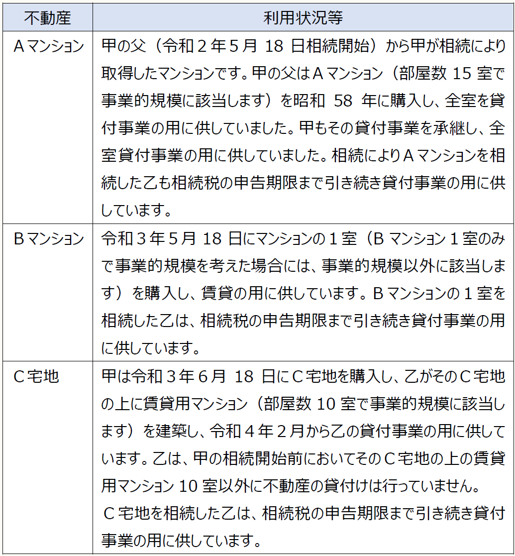 被相続人である甲は令和4年5月18日に相続が発生し、その所有するAマンション、Bマンション、C宅地を配偶者である乙が相続しました。乙は甲と生計を一にする親族に該当します。平成30年度税制改正により、貸付事業用宅地等の範囲から、被相続人等の貸付事業の用に供されていた宅地等で相続開始前3年以内に「新たに貸付事業の用に供された宅地等(相続開始の日まで3年を超えて引き続き特定貸付事業を行っていた被相続人等の当該貸付事業の用に供されたものを除く)」が除かれることになりましたが、上記不動産は、相続開始前3年以内に「新たに貸付事業の用に供された宅地等」に該当し、かつ、相続開始の日まで3年を超えて特定貸付事業を行っていないため、小規模宅地等に係る貸付事業用宅地等の特例の対象にならないと考えていいでしょうか。