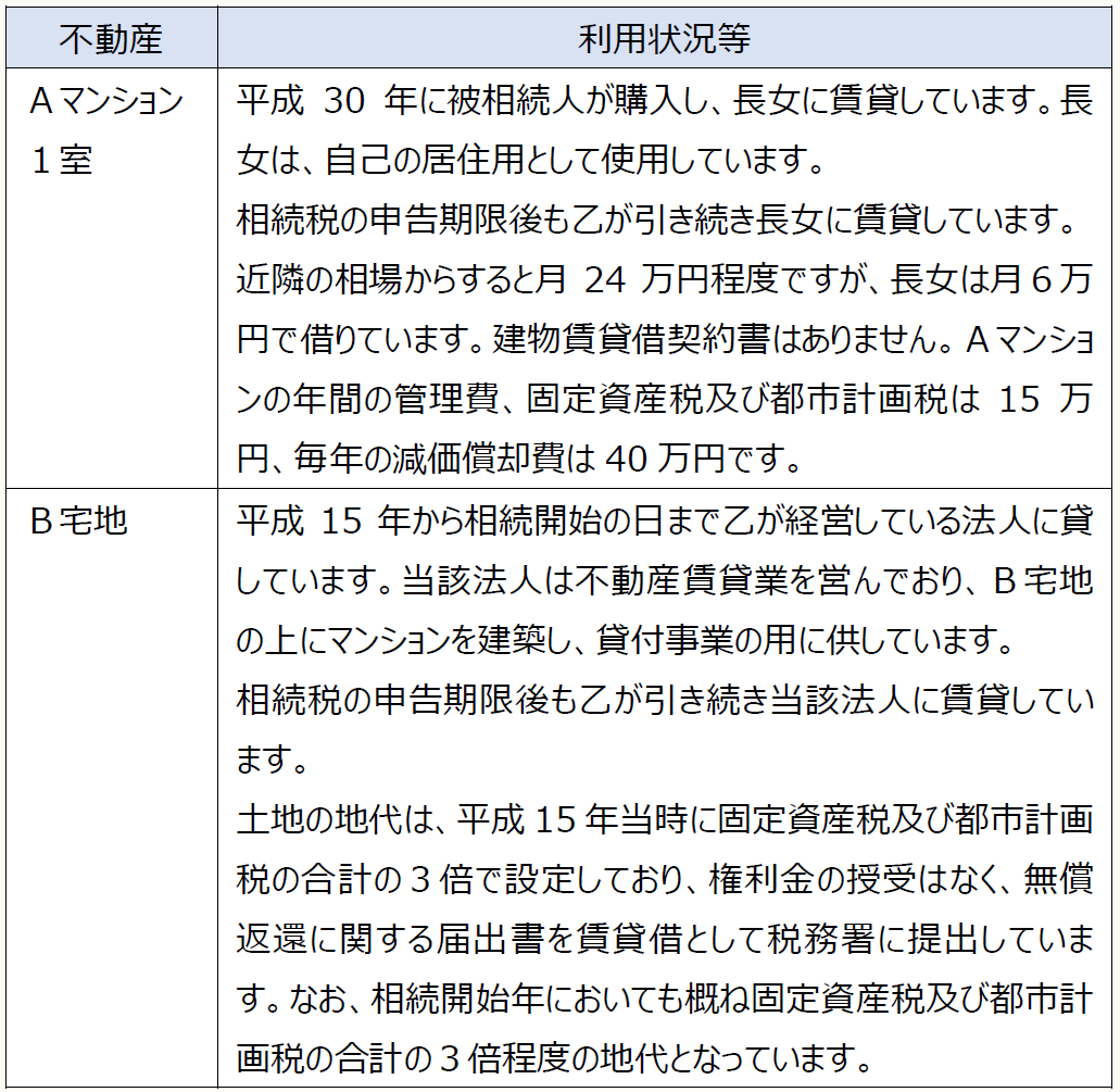 平成30年に被相続人が購入し、長女に賃貸しています。長女は、自己の居住用として使用しています。 相続税の申告期限後も乙が引き続き長女に賃貸しています。 近隣の相場からすると月24万円程度ですが、長女は月6万円で借りています。建物賃貸借契約書はありません。Aマンションの年間の管理費、固定資産税及び都市計画税は15万円、毎年の減価償却費は40万円です。 平成15年から相続開始の日まで乙が経営している法人に貸しています。当該法人は不動産賃貸業を営んでおり、B宅地の上にマンションを建築し、貸付事業の用に供しています。 相続税の申告期限後も乙が引き続き当該法人に賃貸しています。 土地の地代は、平成15年当時に固定資産税及び都市計画税の合計の3倍で設定しており、権利金の授受はなく、無償返還に関する届出書を賃貸借として税務署に提出しています。なお、相続開始年においても概ね固定資産税及び都市計画税の合計の3倍程度の地代となっています。