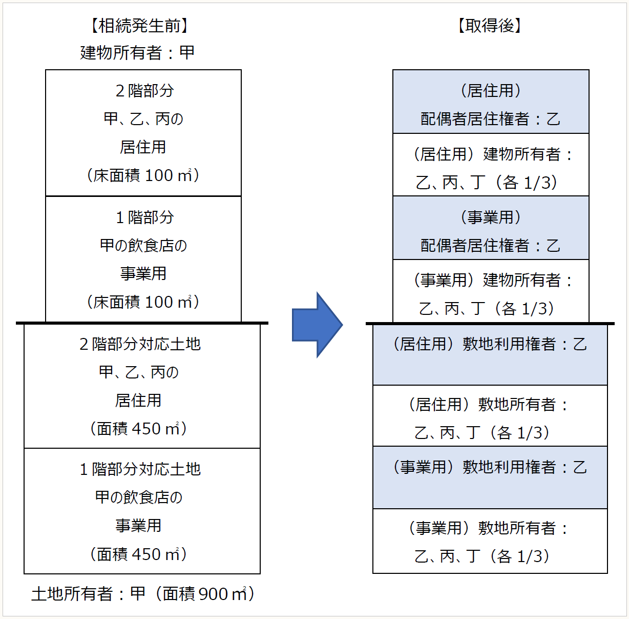被相続人である甲の相続発生に伴い、甲が所有していた下記の土地建物について、配偶者乙が配偶者居住権を取得し、土地建物の所有権を乙、長男丙及び二男丁が共有で1/3ずつ取得しました。相続開始の直前において、乙及び丙は2階で甲と同居しており、小規模宅地等に係る特定居住用宅地等の特例対象者ですが、丁は甲と別居していたため、特定居住用宅地等の特例対象者ではありません。なお、1階部分については、被相続人である甲が飲食店を営んでおり、相続後は、その飲食店の事業を丙が承継していますので、丙は小規模宅地等に係る特定事業用宅地等の特例対象者となります。