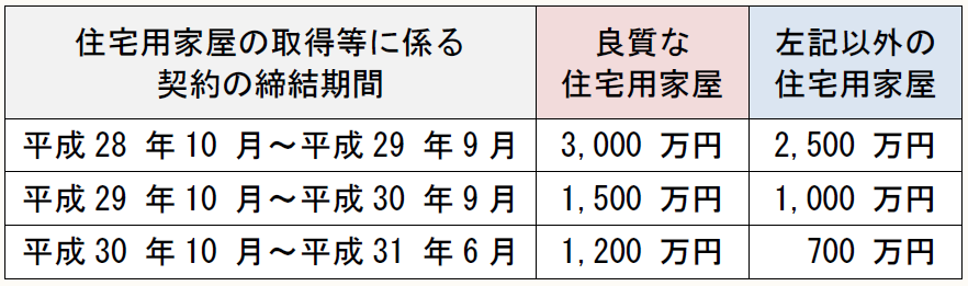 住宅用家屋の取得等に係る 契約の締結期間	良質な 住宅用家屋	左記以外の 住宅用家屋 平成28 年10 月~平成29 年9月	3,000 万円	2,500 万円 平成29 年10 月~平成30 年9月	1,500 万円	1,000 万円 平成30 年10 月~平成31 年6月	1,200 万円	  700 万円