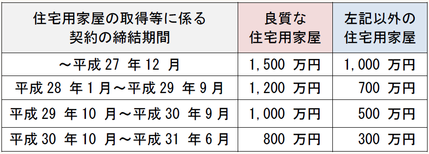 住宅用家屋の取得等に係る 契約の締結期間 良質な 住宅用家屋 左記以外の 住宅用家屋 ~平成27 年12 月 1,500 万円 1,000 万円 平成28 年1月~平成29 年9月 1,200 万円  700 万円 平成29 年10 月~平成30 年9月 1,000 万円 500 万円 平成30 年10 月~平成31 年6月  800 万円  300 万円