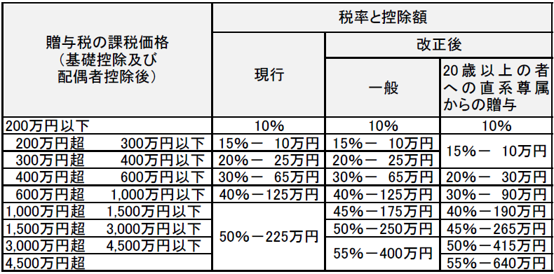 この図表にさらに、[改正後]に[20歳以上の者への直系尊属からの贈与]という欄があって、課税価額が300万円超から4,500万円までの部分の税率が、一般の場合より低くなっていますね。