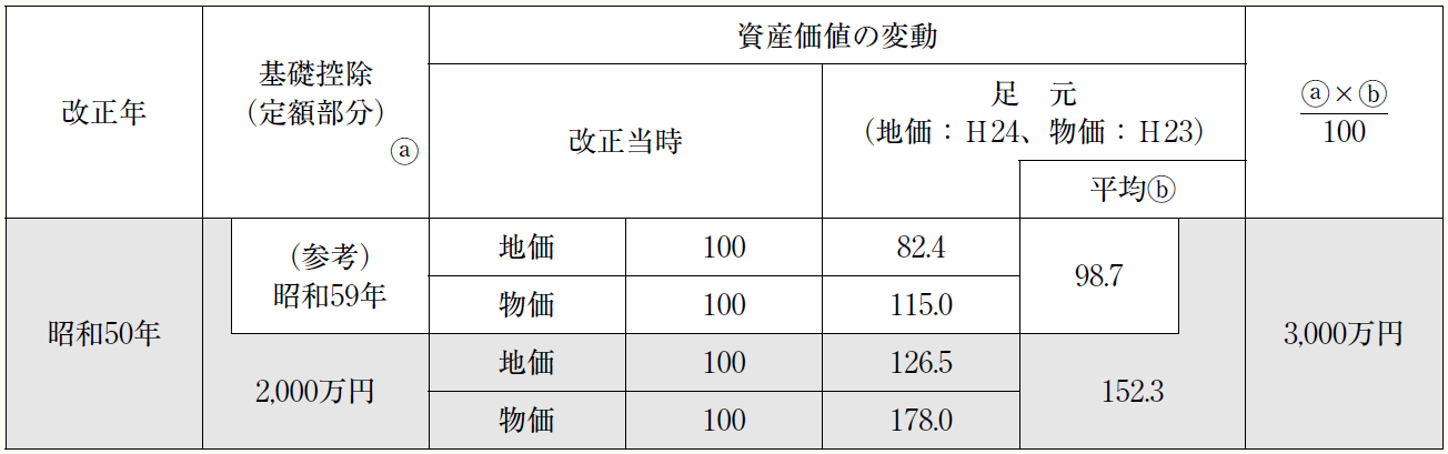 引下げ後の基礎控除の水準については、物価・地価が現在と同等であった昭和50年代後半の水準を参考に、この時期に適用されていた水準まで引き下げることとし、具体的には、昭和50年から62年までに適用されていた水準(定額部分2,000万円、比例部分400万円)を当時からの物価・地価の変化率で現在価値に修正し、定額部分3,000万円、比例部分600万円とされました。