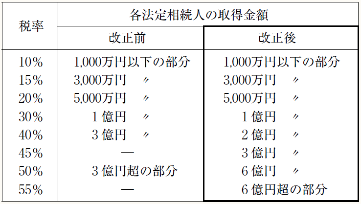 平成25年度税制改正により、相続税の基礎控除の引下げが行われ、かつ、税率構造の見直しが行われた。この改正は、平成27年1月1日以後に相続又は遺贈により取得する財産に係る相続税について適用される(平成25年改正法附則1⑤ロ、10)(※)。