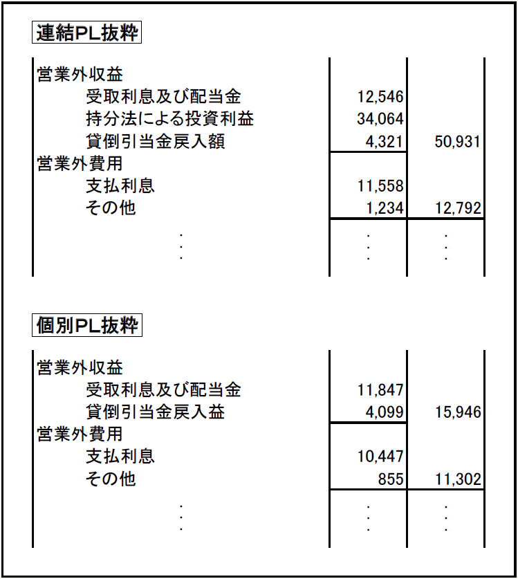 【事例10-1】は、同じ会社・同じ年度の連結損益計算書と個別損益計算書から、営業外損益の部分を抜粋したものです。