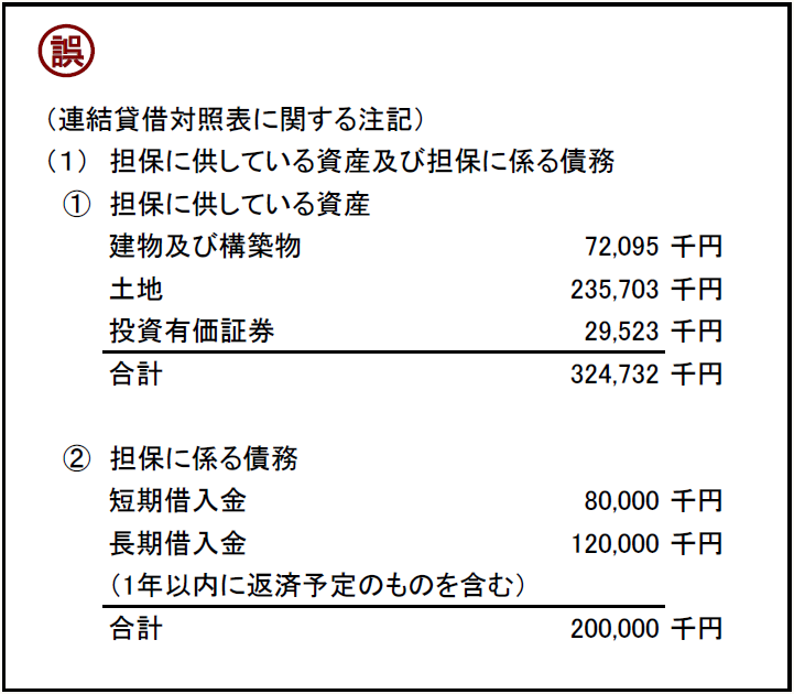 【事例12-1】は連結注記表に記載されている担保提供資産とその対応債務の注記です。この中に間違いが1ヶ所あります。