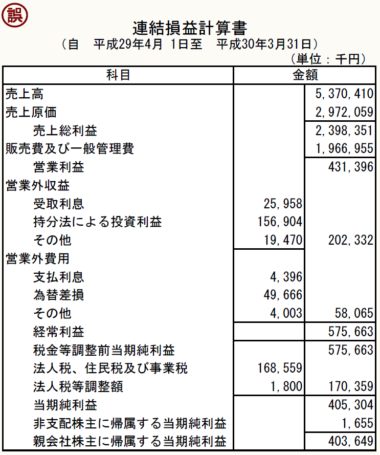 連結損益計算書のフォームで、特に必要のない罫線が1本ある。