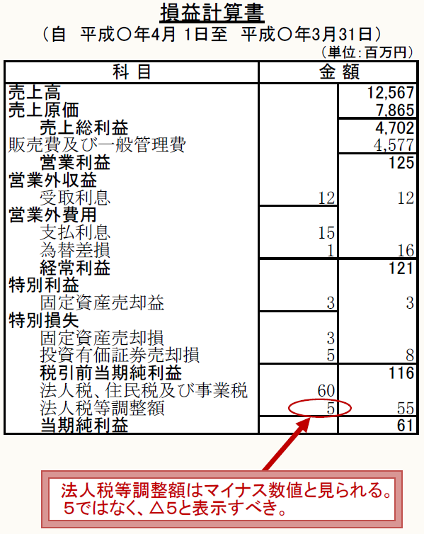 損益計算書の「法人税等調整額」の数字の前に△が表示されていない。