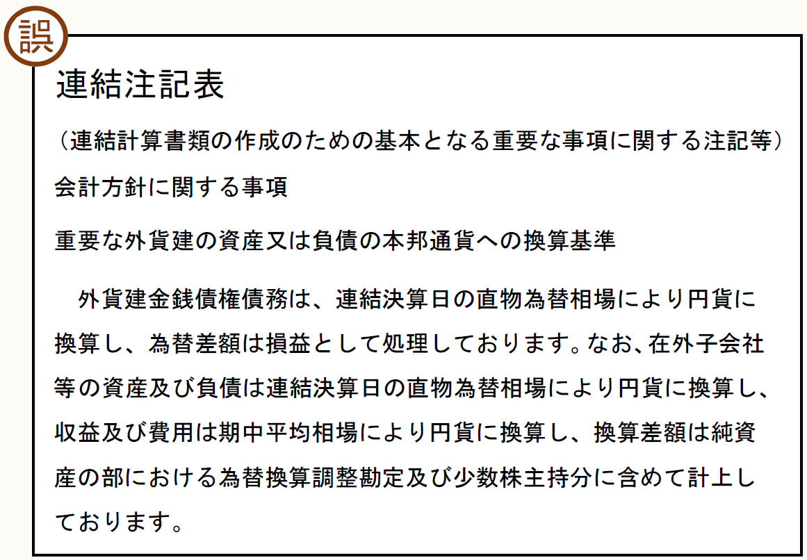 【事例29-1】は、連結計算書類の連結注記表に記載されている「重要な外貨建の資産又は負債の本邦通貨への換算基準」の文章です。この文章の中に1ヶ所、ありえない用語が使用されています。