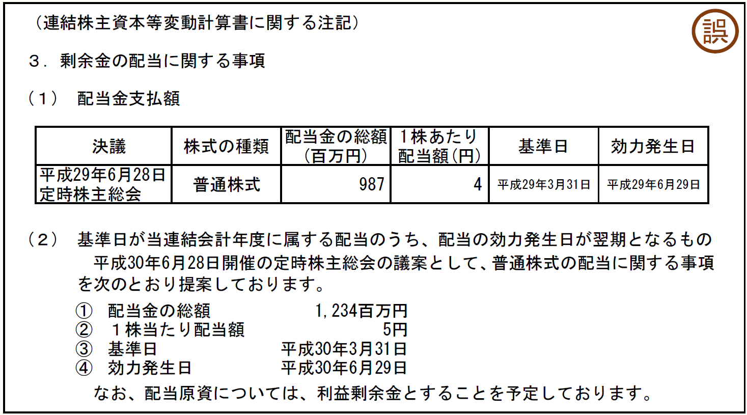 ミスの場所は、3.(2)の記載事項の中ですが、この注記だけを眺めていても、見つけることはできません。株主資本等の数値を合わせて見ていかなければ、わからないでしょう。