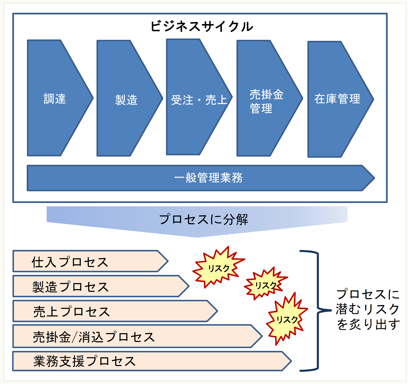 企業活動は財、サービスを顧客に提供し、対価を得て再投資に振り向け生産活動を継続、拡大させる一連の発展的サイクルによって成り立っています。このビジネスサイクルをプロセスの単位に切り分け、更にプロセスを構成するサブプロセスに分解して、リスクに直接アプローチするのです。