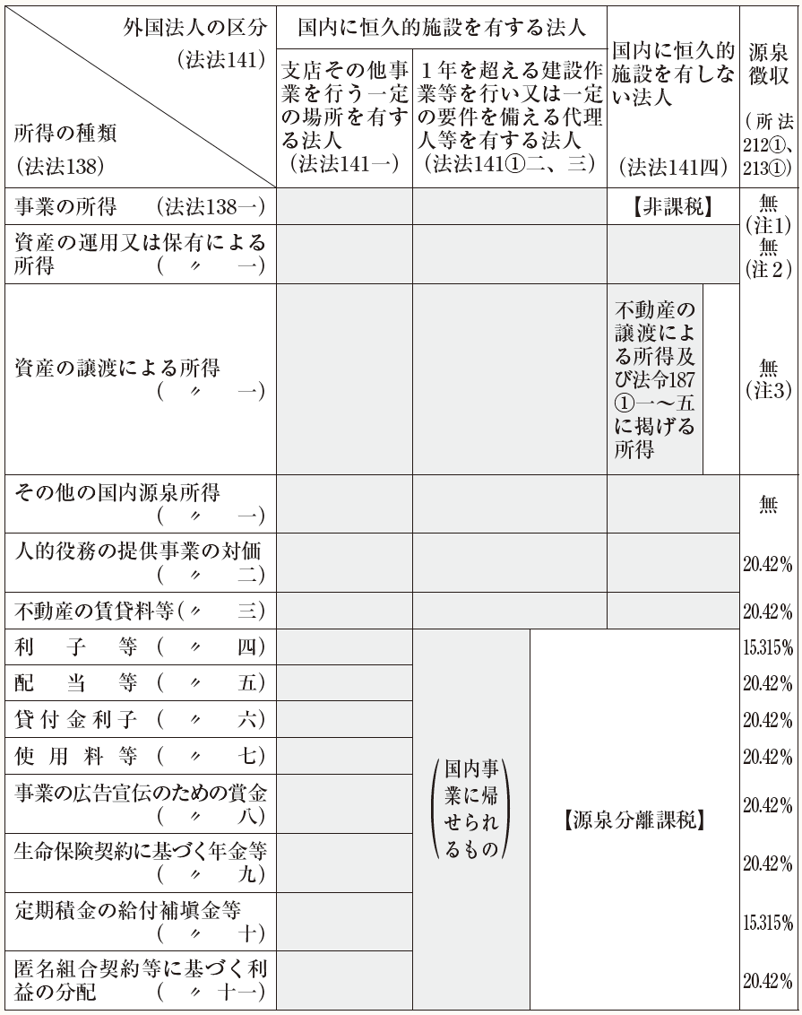 また、PEがない外国法人は、一定の国内源泉所得を除いて源泉徴収のみで課税関係が完結することとされた。具体的には、PEがない外国法人は「事業の所得」は非課税となり、1号所得のうち「事業の所得」以外の「資産の運用又は保有による所得」と「資産の譲渡による所得」と2号、3号所得が総合課税され、4号所得以下は源泉分離課税方式による所得税の課税で完結する方式を採っていた。