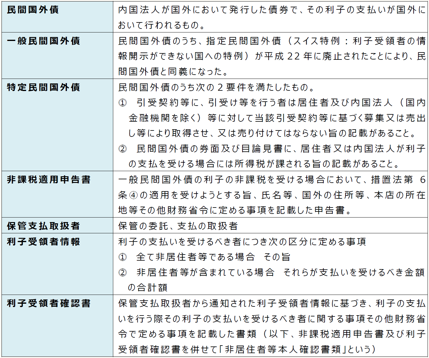 ⑦ (特定民間国外債利子の非課税要件:本人確認手続)非居住者又は外国法人(以下「非居住者等」という)が特定民間国外債であって保管の委託をしている者につき利子の支払いを受ける場合において、当該保管支払委託者で利子の受領の媒介等をするものがその利子の交付を受けるときまでに利子受領者情報を利子の支払いをするものに通知し、かつ、その利子の支払いをするものが、利子受領者確認書を作成し所轄税務署長に提出したときは、非課税適用申告書を提出したものとみなす。