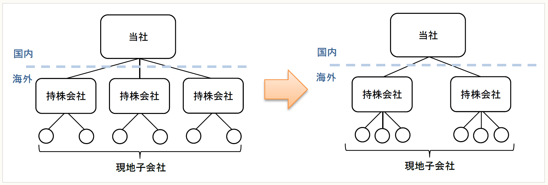 日本法人である当社は、海外に複数の子会社(持株会社)を有しており、それらの持株会社を通じて各国に子会社(現地子会社)を有しています。今般、経営の効率化の観点からグループ再編を実施して、持株会社を整理することを検討しています。