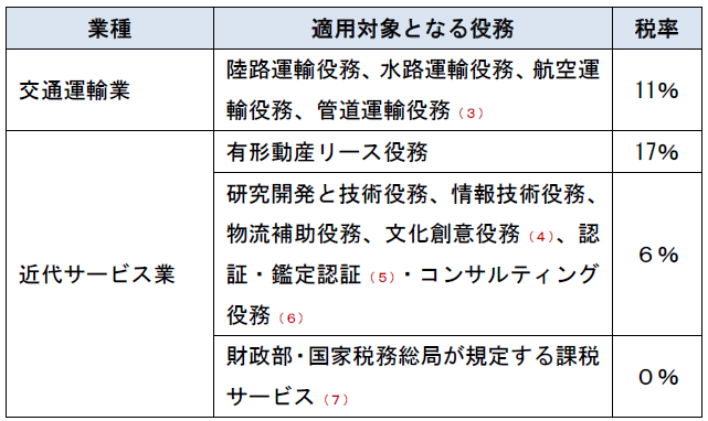 (2) 財税[2011]111号には「交通運輸業と一部の近代サービス業の営業税を増値税へ移行する試験実施弁法」などの3つの付則が含まれている。