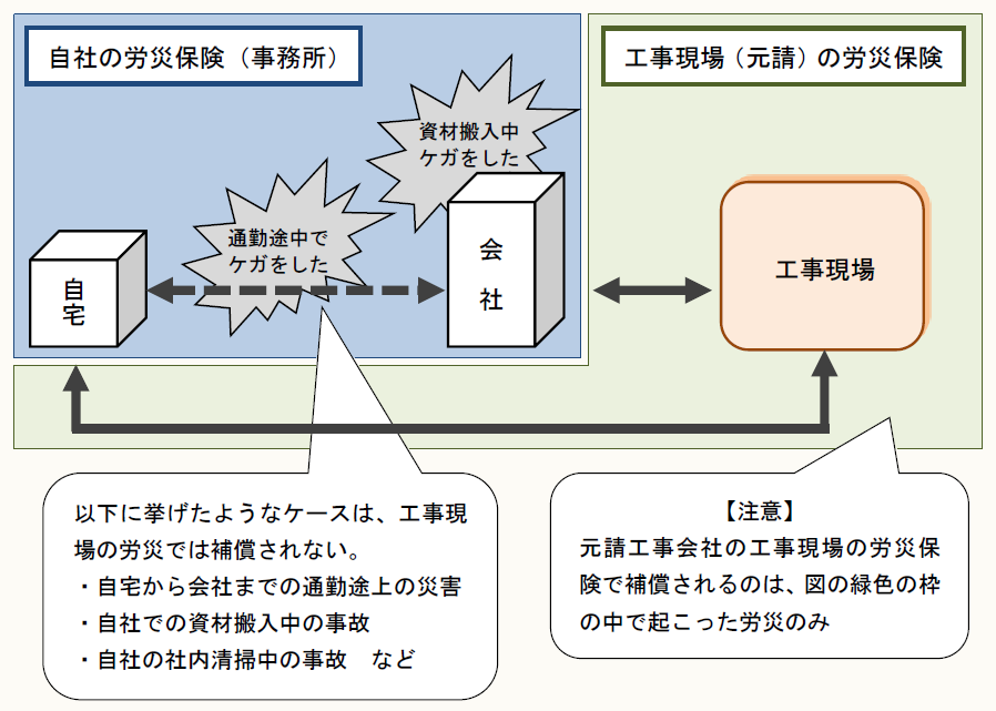 上図のように、下請であっても労働者の日常の動きを考えると、工事現場の保険関係だけでは不十分で、事務所(現場以外)の保険関係は自社で成立させる必要がある。