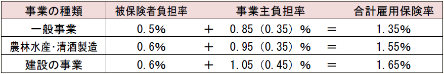雇用保険料は、雇用保険被保険者の賃金総額に事業の種類に応じて次表の保険率を乗じて算出するが、その雇用保険率の事業主負担率の中には雇用保険二事業のための保険率(表中カッコ内の率)が含まれており、その額は全額が事業主の負担となっている。